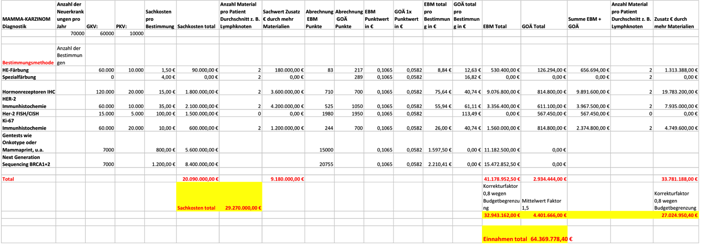 Das Marktvolumen in Deutschland beträgt bei 70.000 Neuerkrankungen Mammakarzinom im Jahr ca. 64,4 Mio € Umsatz durch Abrechnung bei den Krankenkassen bzw. Selbstzahlern. Die Sachkosten (Einkauf von Materialien und Reagenzien, inkl. Anteilige Gerätenutzung = Reagenzienleasing) für die angeführten diagnostischen Bestimmungen liegt geschätzt bei 29,3 Mio €. Bei 70.000 Patienten betragen die Kosten pro Patient ohne Gentests (64,4 Mio €– 26,7 Mio € = 37,7 Mio €) =538,50 €. Dieser Wert erscheint durch den Vergleich mit der Analyse des Pathologen auf der Vorseite aus dem Jahr 2009 realistisch. Es gibt aber einige Parameter wie die Anzahl der abgerechneten Materialien (z. B. Anzahl der Lymphknoten) Verhältnis OP-Materialien zu Biopsien, Änderungen der Leitlinien, Anteil der Abrechnungen nach EBM oder GOÄ, bzw. bei stationären Patienten der Steigerungsfaktor, die eine Abweichung von 10-15 % vom wirklichen Wert möglich machen. Nimmt man die Gentests dazu, so sind die Kosten pro Patient bei 920 € aktuell. Hier wird von einer Quote von 10 % aller Patienten ausgegangen, die aktuell neben der Standard-Diagnostik auch weitere Gentests erhalten. Durch die Abbildung im EBM Kapitel 19.4 wird die Zahl der durchgeführten und abgerechneten Gentests sicher in Zukunft stark zu nehmen.